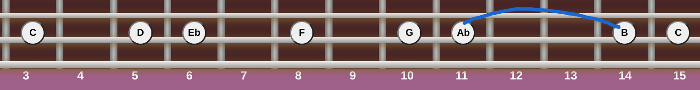 The interesting thing about the harmonic minor scale is the three fret interval between the 6th and seventh note of the scale.